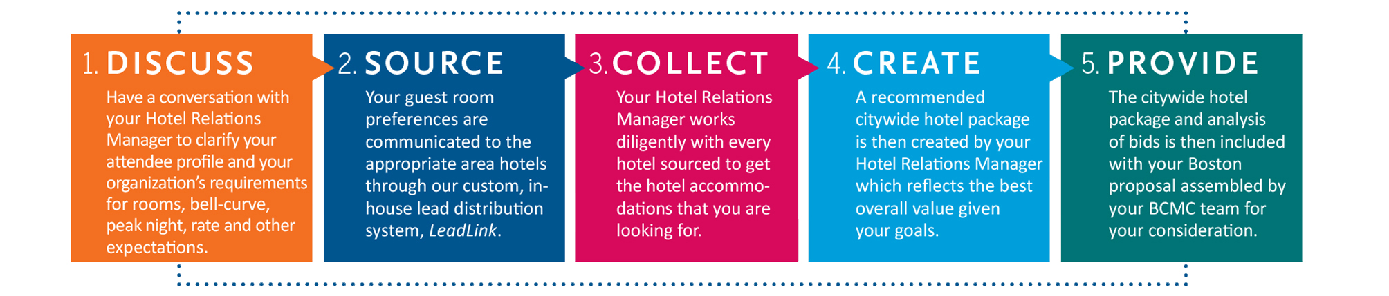 We know that securing hotel rooms can be a job unto itself. That’s why we have an exclusive Hotel Relations Team that helps make your job easier. Your dedicated Hotel Relations Team works in tandem with your Sales Manager and serves as your liaison to Boston’s hotel community, helping you to build the ideal room block for your event. As the first of its kind, our innovative Hotel Relations team is your personal concierge to the Boston hotel community. It’s one point of contact, so you save time and money while we work to find the best solutions for your event.